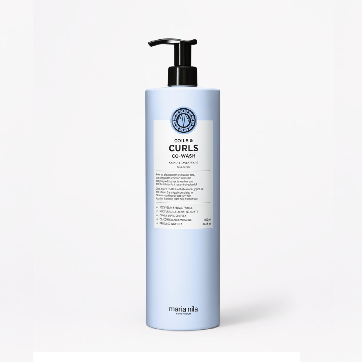 Maria Nila Coils & Curls Co-Wash er beriget med Maria Nilas innovative Curl Guard Complex, som indeholder sheasmør, avocadoolie og hybenolie. Disse ingredienser sørger for at fugte, tilføre glans og forhindre håret i at knække. Denne effektive formel forstærkes af en nærende blanding af jojobaolie, aloe vera, hibiscus ekstrakt og E-vitamin, der plejer, blødgør og skaber balance i både hår og hovedbund.