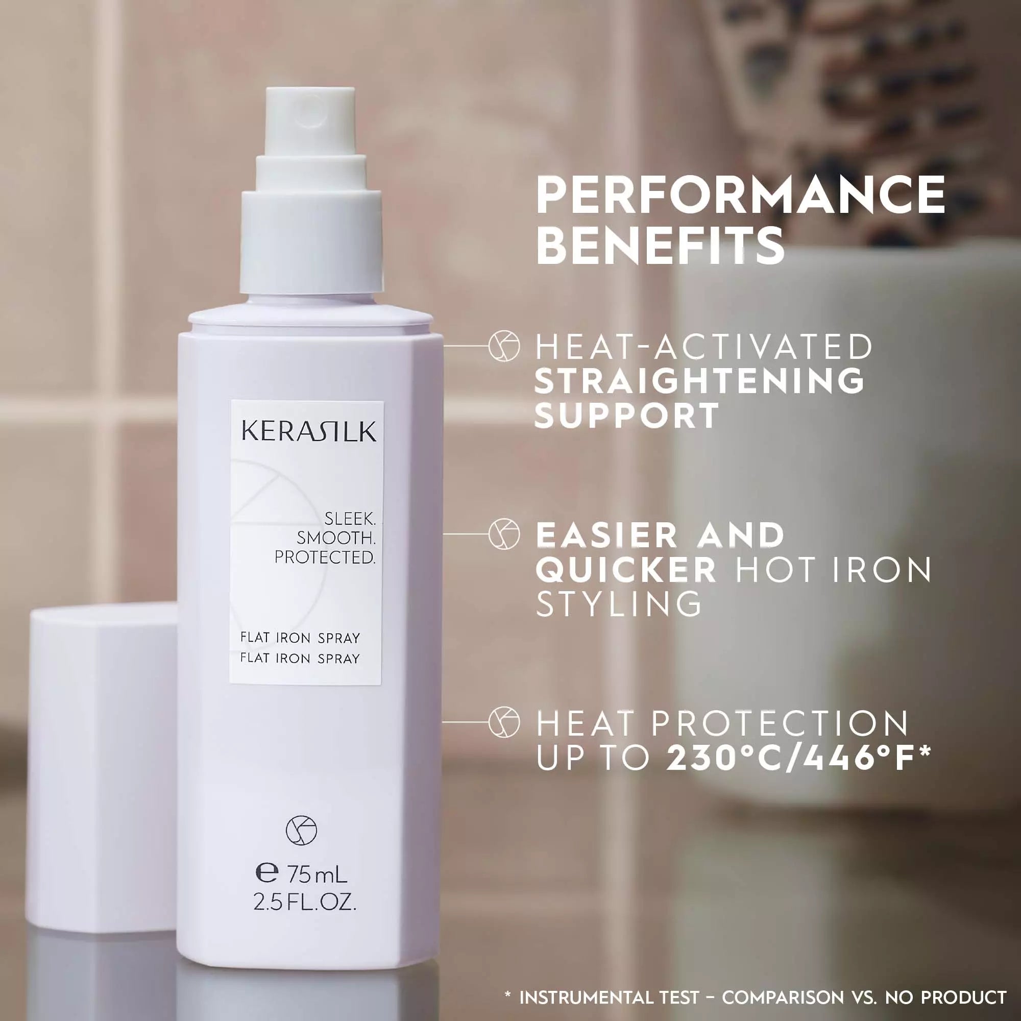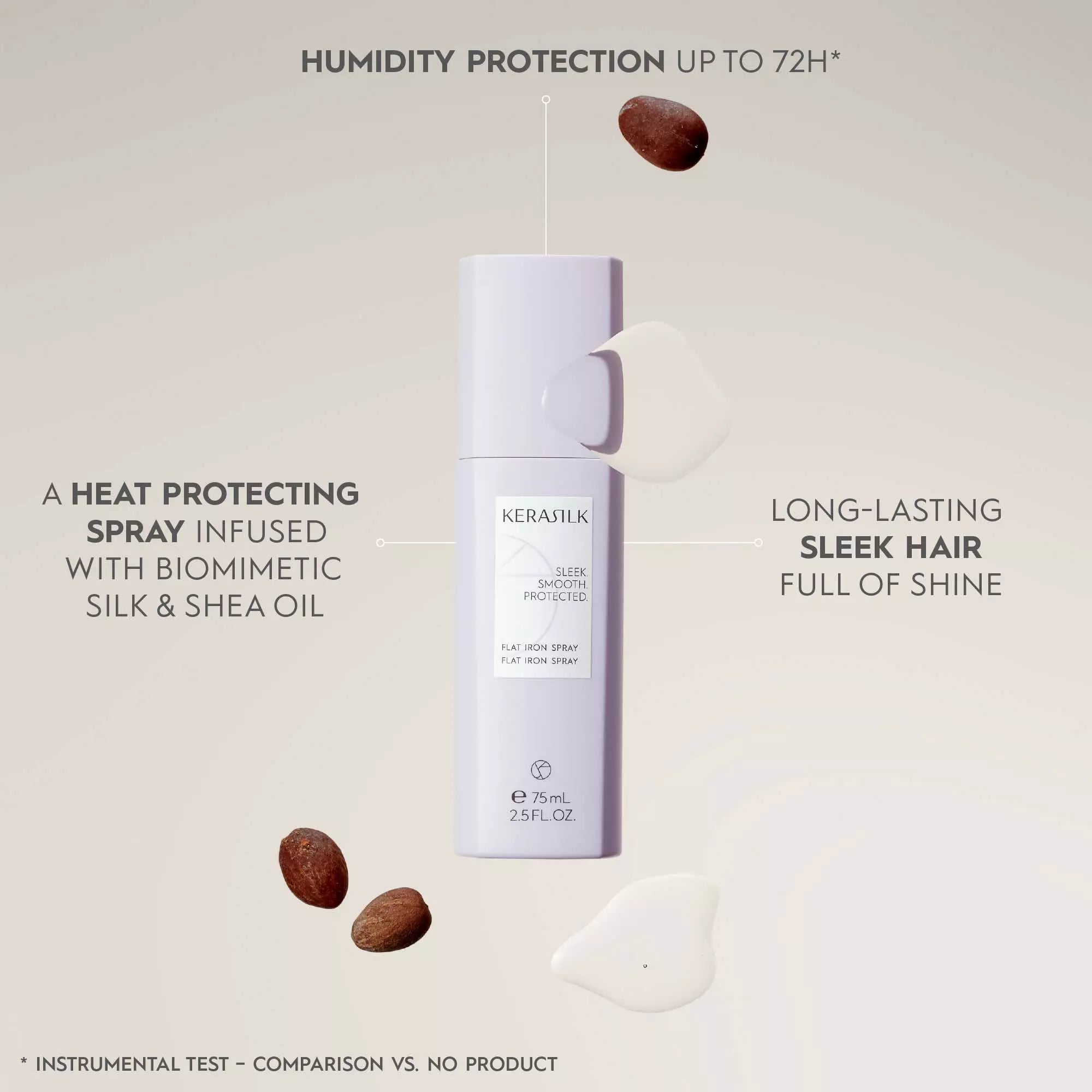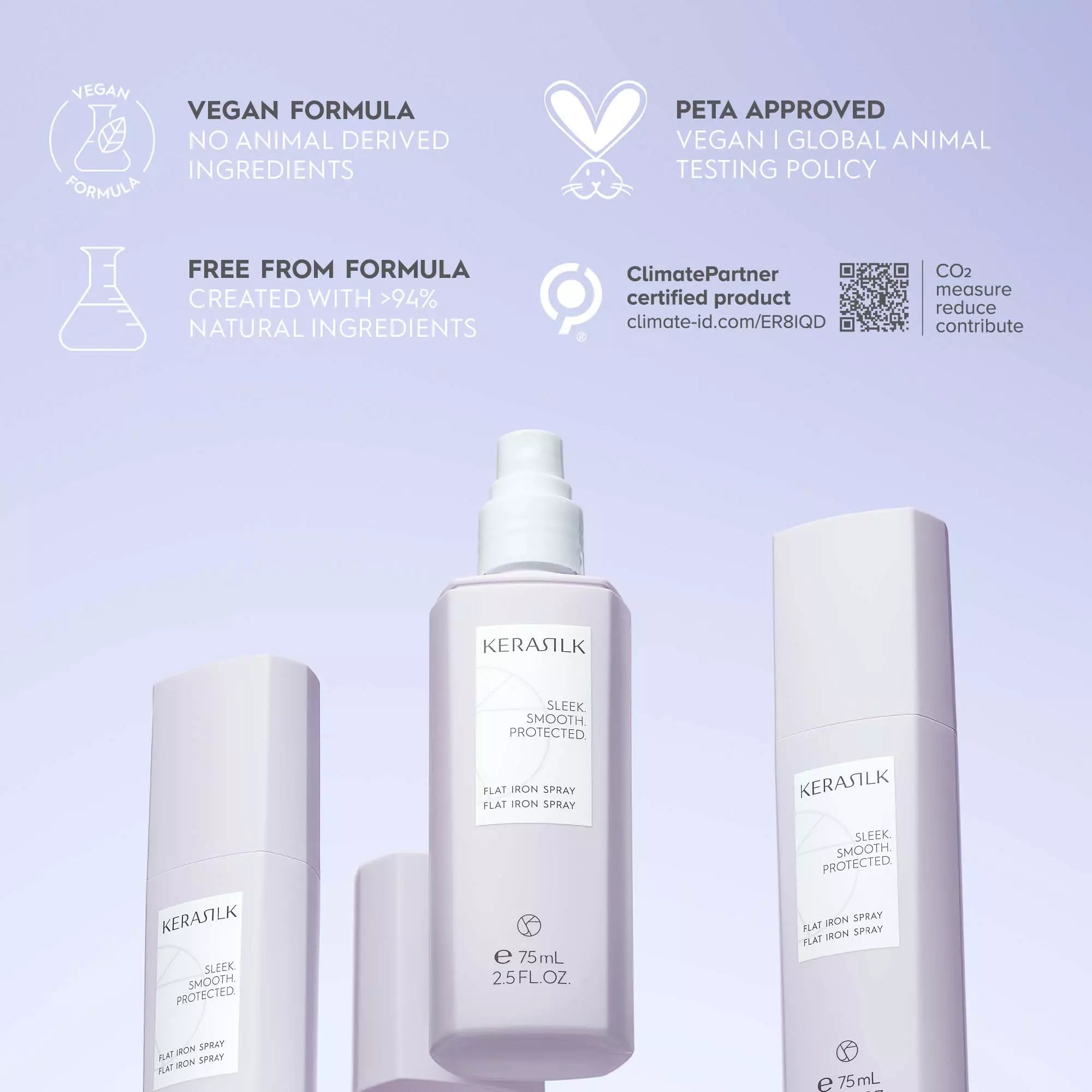 Kerasilk Flat Iron Spray er den ultimative varmebeskyttende spray til dig, der ofte bruger glattejern eller andre styling tools. Den er udviklet til at beskytte håret mod varmeskader op til høje temperaturer, samtidig med at den reducerer frizz, giver glans og efterlader håret silkeblødt og glat hele dagen.