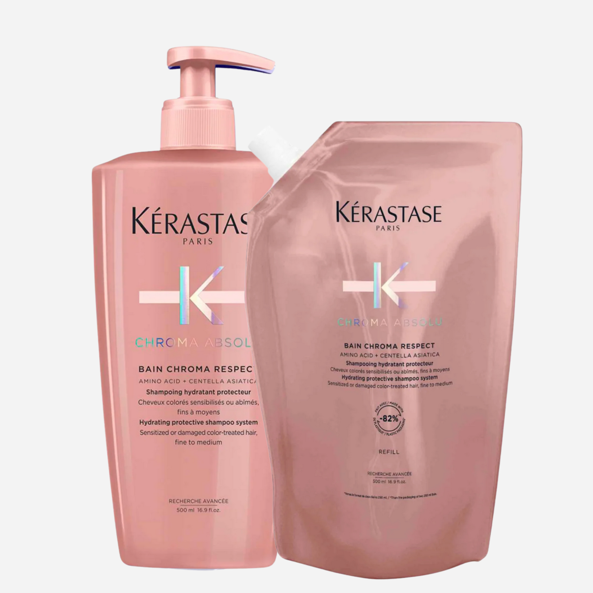 Kérastase Bain Chroma Respect Shampoo Refill Kit er perfekt til dig med farvet eller afbleget hår, der ønsker at bevare en levende farve og samtidig passe på dit hår og miljøet. Med dette kit får du både en 500 ml shampoo og en 500 ml refillpose, så du kan genopfylde flasken og reducere dit plastforbrug.