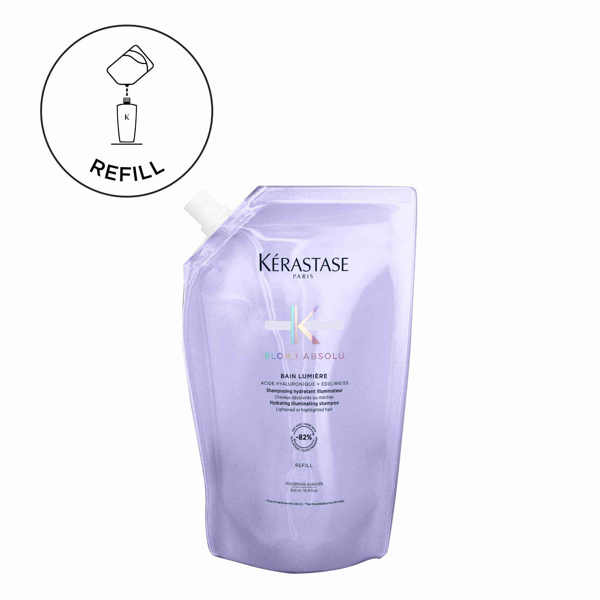 Kérastase Blond Absolu Bain Lumiére Shampoo Refill Kit er den perfekte løsning til dig med blondt, afbleget eller stribet hår, der ønsker både pleje og glans i én enkel rutine. Med dette kit får du 500 ml luksuriøs shampoo i flaske samt en 500 ml refillpose, så du kan spare på emballagen og forlænge oplevelsen.