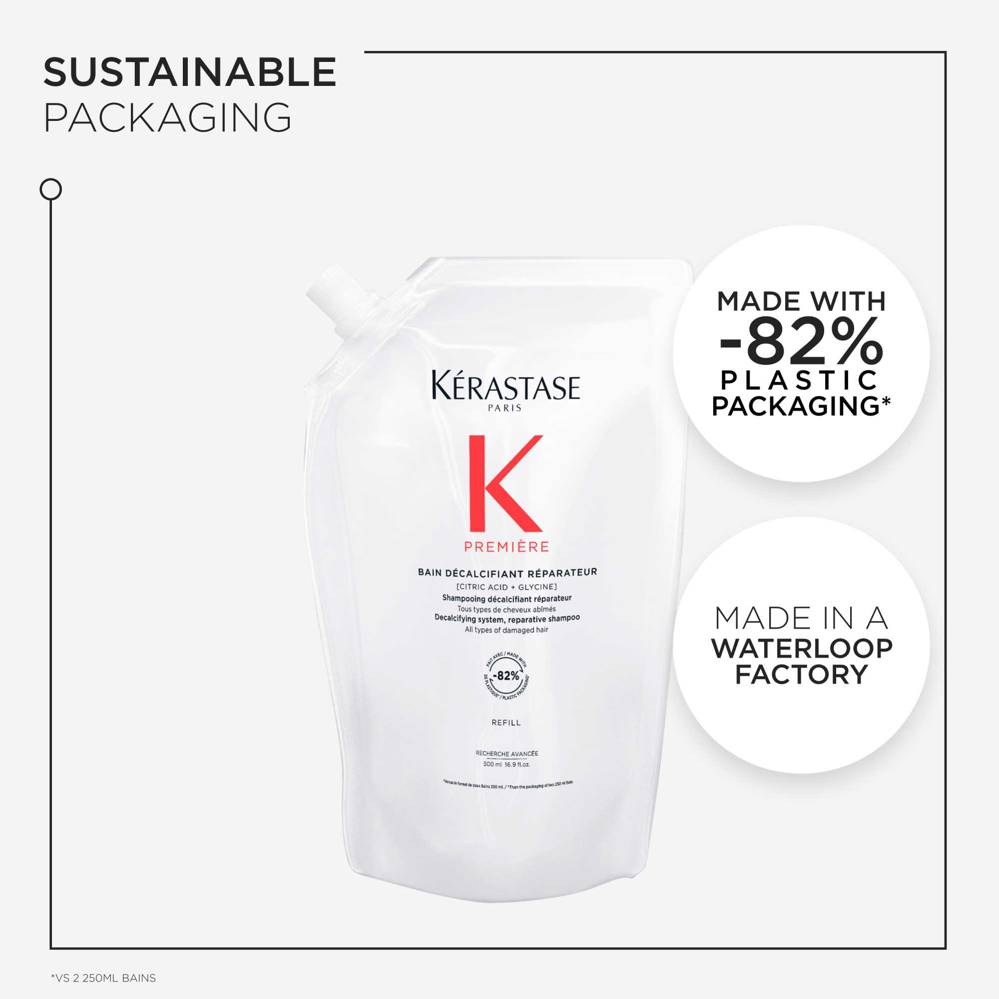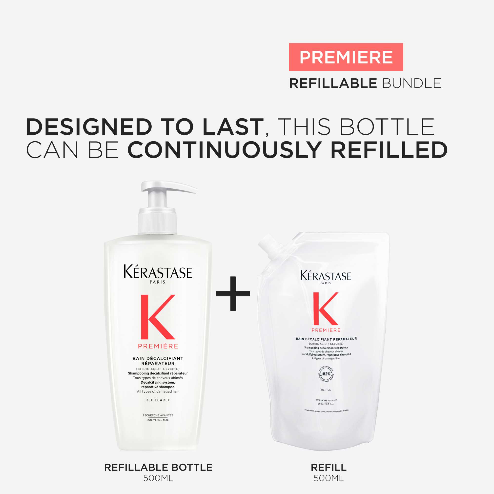 Hæld indholdet af refillposen i din Kérastase 500 ml shampoo-flaske. Påfør en passende mængde i vådt hår, massér grundigt ind i hår og hovedbund, og skyl derefter. For bedste resultat kombineres shampooen med Kérastase Première Fondant Fluidité Réparateur og Première Masque Filler Réparateur.
