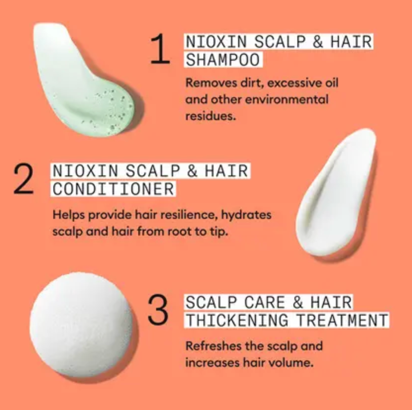 Afslut med Nioxin Scalp & Hair Treatment, massér blidt ind i hovedbunden – skal ikke skylles ud.