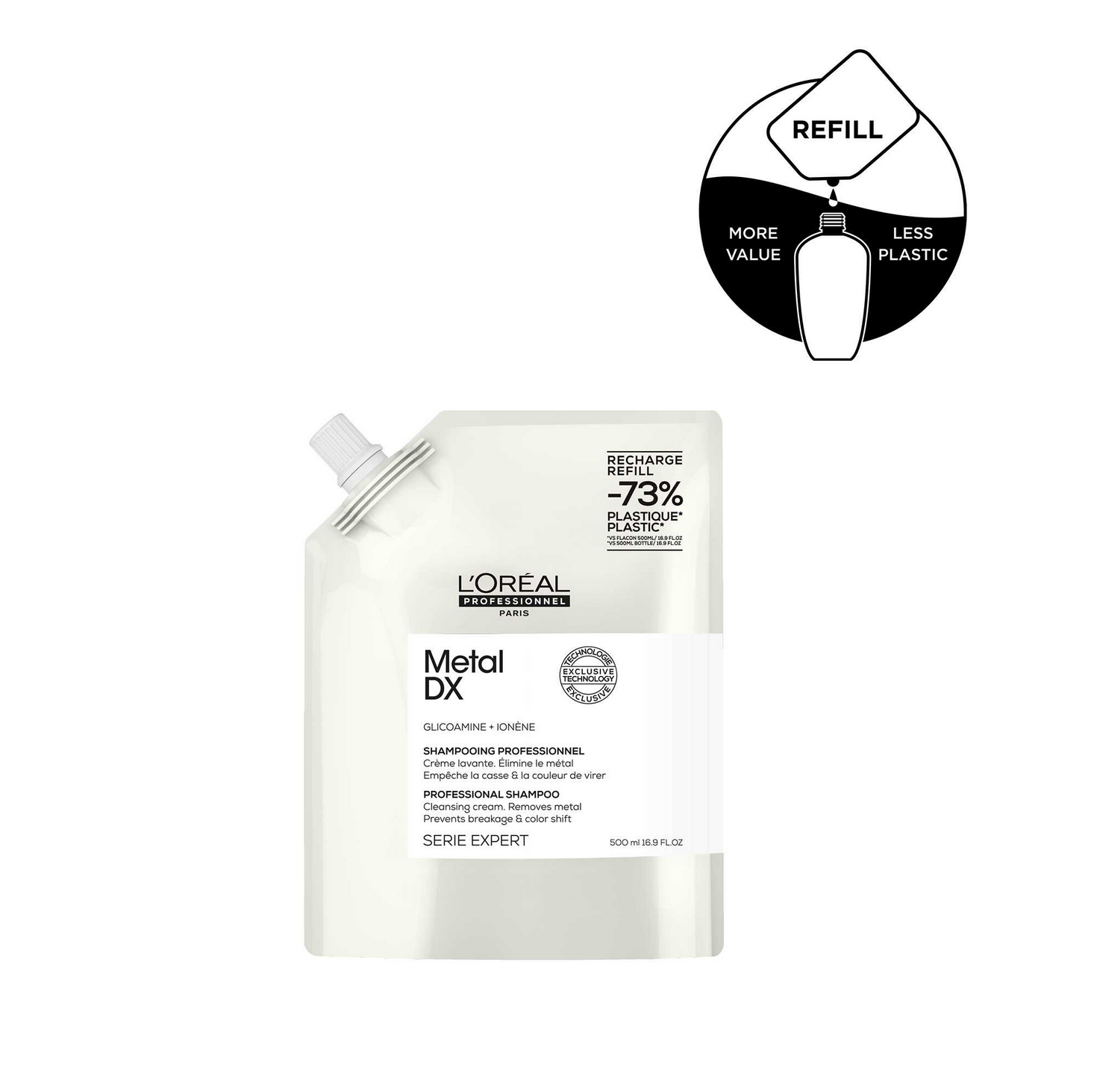 Opdag L’Oréal Professionnel Serie Expert Metal DX Shampoo, et komplet kit til beskyttelse af farvet og kemisk behandlet hår. Kittet indeholder både den originale 500 ml shampooflaske og en 500 ml refillpose, så du nemt kan genopfylde flasken og reducere plastaffald – en smart og bæredygtig løsning til dit hår.